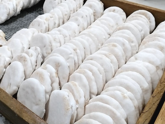 今日は、大判の七味と大辛せんべい。小粒エビと黒ごませんべい。大判黒ごませんべい。揚げの醤油煎餅。他、トレードマーク&メッセージ印刷用醤油味を2種焼きました。昨日砂糖掛けして、一晩乾燥させた白いお煎餅が出来上がっています。