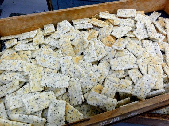 今日は、青のり入り短冊型せんべい。小丸、エビと青のりの塩サラダせんべい。丸角の醤油せんべいなどを焼きました。