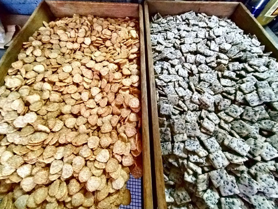 今日は、小粒黒ごま角白醤油味と、おにぎり型醤油せんべい。短冊型焼き海苔せんべい、大判角焼き海苔とおぼろ昆布せんべい。他、イラストメッセージ印刷用醤油せんべい、薄焼き粒入り醤油せんべいなどを焼いています。