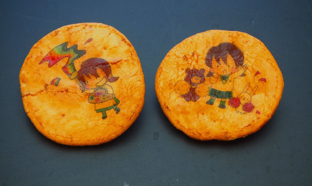写真は、毎年月に頂戴している、東京の私立学校のバザーで販売されているというおせんべいです。キャラクターが描かれかわいいおせんべいです。
