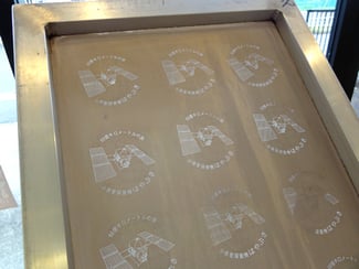 特殊なメッシュスクリーンにイラストや文字などのデザイン画を焼き付けて、印刷版として使用します。スクリーン越しに粉インクを静電気でおせんべいの表面に乗せ、80℃以上に加熱して定着させます。
