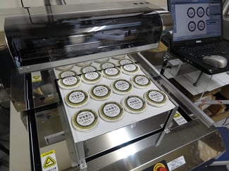 ●PC用紙印刷のインクジェットプリンターと、基本的に原理は同じです。お客様より頂戴したデータ、ご依頼でレイアウトして製作したデータを直接おせんべいに出力します。非常に鮮明な印刷が可能です。およそ8ポイントくらいの文字まで再現可能です。