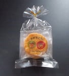 A:印刷面を保護するために、「ぷりんたぶるせんべい」は一枚ずつ透明のフィルムで包装してお届けします。表面は印刷された絵柄がよく見えるように透明です。また裏面は製造者として弊社名、所在地表記の他、おせんべいの原材料、保存方法、賞味期限等法令で義務づけられた表示がされています。