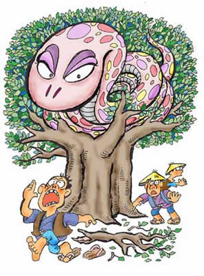 しかしそこには、今までうっそうと茂っていた桧の大木がありません。その根っこだけが黒く残って、大きなうつろのようになっていました。中に、黒焦げになった大蛇の死骸がありました。 村人たちは大蛇の死骸をねんごろに祀ったそうです。