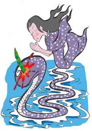 娘は悲しみました。そしてとうとう川に身を投げてしまいました。 娘の体は蛇に変身して川をさまよううちに、誤ってそこで作られていた大角豆のさやで目を突いてしまったというのです。