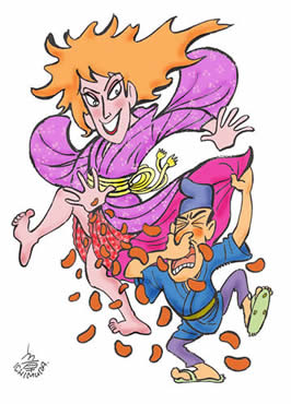 宇太郎は絶体絶命、覚悟を決めて山姫の着物の裾をつかんで、お尻をパッとまくってやったのです。さすがの山姫も面くらい、袂から柿の種をこぼしながら逃げ出しました。宇太郎も必死で裾をつかんだまま離しません。山姫も尻をまくられたまま今度は柿の種を宇太郎の頭に打ちつけ始めました。いやその種の臭いこと、臭いこと、目がくらむほどでした。