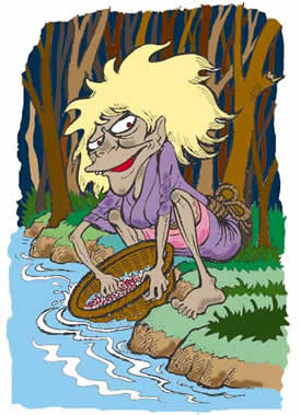 石橋部落の東側は、こんもりと樹木がおいかぶさって、昼間でも薄暗く、鳩川の流れる音だけがさらさらと聞こえるだけで、不気味な感じのするところでした。ある日、 通りかかった旅人が、汗ばんだ顔を拭こうと流れのよどみに手ぬぐいを湿らせようと、ふと、さらさらと音のするほうに目をやりました。 そのとたんに、今拭こうとしていた汗がさっと引いてしまったのです。 白髪を振り乱したお婆さんが、恐ろしい顔をこちらに向けて、アズキをといでいたのです。 流れの音だと思っていたさらさらという音は、アズキをとぐ音だったのです。 「旅の人、今夜はうちに泊りますかな?」旅人はその声がまだ終わらぬうちに、一目散に逃げ出しておりました。それは「アズキとぎ婆」というお化けだったのです。