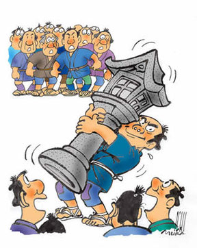 田名の総代たちはわけを話しましたが聞いてもらえません。ところが、信州側が石灯籠を持ち上げようとすると灯篭はびくとも動きません。田名の総代が持ち上げると、軽々と上がります。これには信州側も折れて、田名に譲ることにしました。こうして石灯籠は八幡宮に安置されて、この時から的祭(まとまち)の神事が行われるようになったという事です。